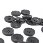 Klassisk rund knap i sort horn med 4 huller. Horn er et naturligt materiale, og hver knap har sit eget diskrete farvespil og udtryk. Denne enkle og tidsløse knap er velegnet til mange typer af projekter og giver et roligt og gennemført finish.