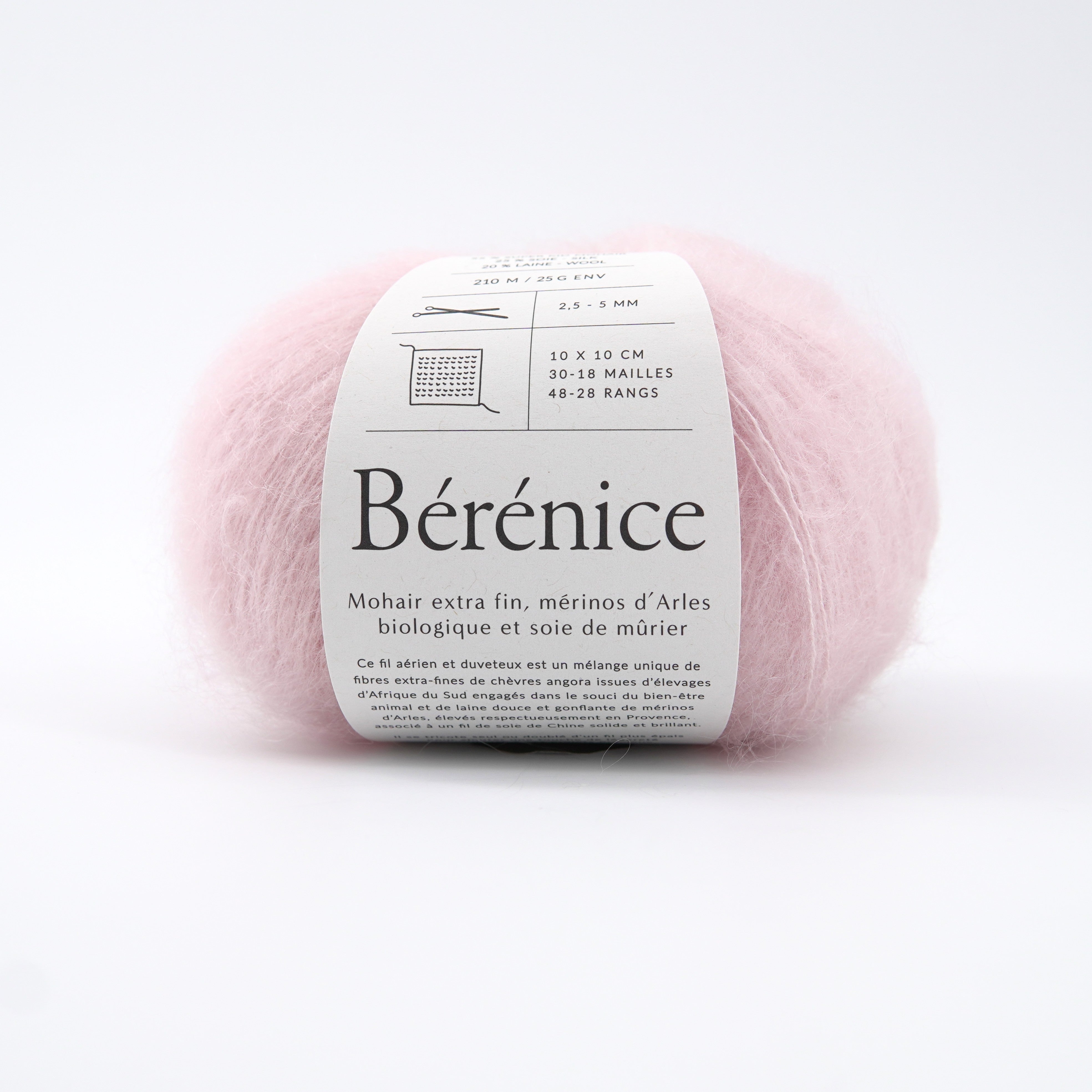 Bérénice er en unik blanding af ekstra fin Super Kid Mohair og den bløde merinould, som De Rerum Natura er kendt for, spundet omkring stærkt, shiny silkegarn og derefter kæmmet for at opnå det vamsede og fluffy udtryk.